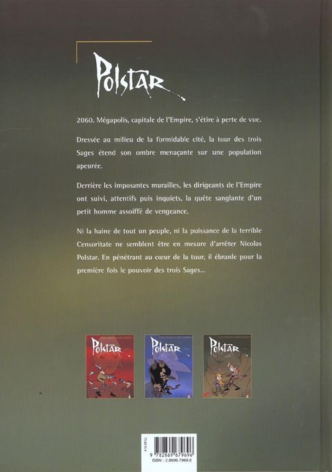 Par la force des choses, Nicolas Polstar, nabot chétif, rigolo, mais complètement inoffensif, est devenu un impitoyable justicier, un tueur sans scrupules, luttant contre l'hégémonie totalitaire des Trois Sages. Accompagné du Monkey, de deux de ses singes rescapés, et de la petite Abigail, Polstar s'est introduit dans la Censoritate, l'immeuble des trois démiurges. Ils sont tous décidés à se battre jusqu'à la fin, jusqu'à leur dernier souffle, pour supprimer les tyrans et renverser le pouvoir. Mais en entrant dans la Censoritate, se doutèrent-ils qu'ils pénétraient dans le plus abominable des pièges, dans une immense toîle d'araignée où la bien nommée Mygale, la plus redoutable des trois sages, les attendait... Vont-ils parvenir à renverser le pouvoir et, si oui, que vont-ils en faire ?...Voici dèjà le troisième et dernier volet de "Polstar", une série qui fait peau neuve dans la collection Fantastique des Editions Vents d'Ouest. Initialement parue dès 96, cette superbe série, qui mêle action, anticipation, cruauté et humour décapant, peut maintenant rencontrer un plus large public, et c'est tant mieux !
