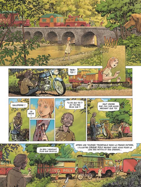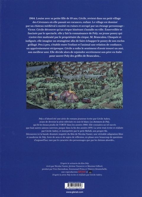 1964. Louise, accompagnée de Cécile, sa petite fille de 10 ans, revient dans un petit village des Cévennes où elle passait ses vacances enfant. Le village est dominé par un château médiéval à moitié en ruines et occupé par un étrange personnage : Victor. Alors que Cécile peine à nouer des liens d’amitié avec ses nouveaux camarades, elle découvre qu’un cirque itinérant s’installe en ville. Emerveillée et fascinée par le spectacle, Cécile y fait la connaissance de Poly, un jeune poney qui s’avère être maltraité par le propriétaire du cirque, M. Brancalou. Choquée et indignée, elle imagine un stratagème pour libérer le poney de son enclos grillagé. Peu à peu, s’établit entre l’enfant et l’animal une relation de confiance, un apprivoisement réciproque. Cécile a enfin le sentiment d’avoir trouvé un ami, son meilleur ami. Tout le monde recherche Poly, les habitants du village, les gendarmes, et surtout M. Brancalou. Seul Victor finit par percer le secret de Cécile. Elle décide alors de rejoindre secrètement son père en Italie pour sauver Poly des griffes de Brancalou.Adaptation fidèle du nouveau film de Nicolas Vanier qui sort le 7 octobre, Poly propose une bande dessinée en phase avec beaucoup de questions actuelles, tant par le caractère des personnages que par les thèmes abordés, notamment sur le rapport homme animal…