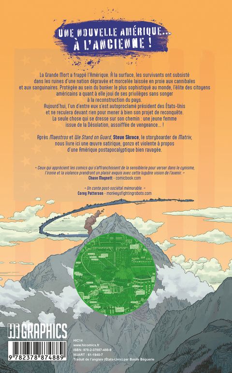 Après son chef-d'oeuvre halluciné Maestros, Steve Skroce fait son grand retour chez HiComics !Lorsque la grande mort a frappé l'Amérique, l'élite a trouvé refuge dans un bunker gouvernemental super-équipé, la Bulle. Mais tout le monde n'a pas réussi à l'atteindre, et seuls les plus fortunés s'y sont barricadés, laissant le reste de la population à la merci du feu nucléaire. Quatre-vingts ans plus tard, un nouveau président autoproclamé émerge et tente de séduire le peuple de la surface. Mais une jeune femme, Carolyn, résidente des terres désolées, a bien l'intention de prendre sa revanche et empêcher ce fou furieux de rendre l'Amérique plus infernale encore.Steve Skroce, le storyboarder de Matrix, livre une satire politique furieusement corrosive qui évoque autant les imaginaires de Mad Max, Borderlands ou Idiocracy en s'inscrivant dans la générosité graphique du Shaolin Cowboyde Geof Darrow. Un récit plein d'action dessiné de main de maître. Marrant, gore, mais malin dans son approche du sujet. Récit complet.