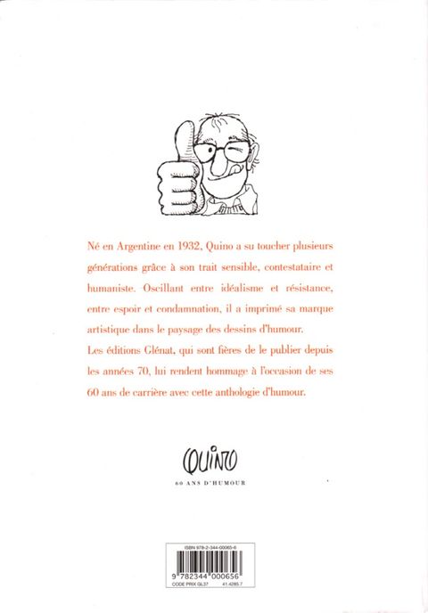 Auteur de la célèbre petite Mafalda, Quino est avant tout un maître du dessin d’humour. Sa sensibilité, son trait et son talent ont permis à sa réputation de dépasser les frontières de son pays d’origine, l’Argentine, pour devenir un auteur connu et reconnu à travers le monde entier. 2014 est l’année de tous les anniversaires pour Quino ! En effet, en plus des 50 ans de son héroïne mythique, cette année célèbrera le soixantième anniversaire de sa carrière. 60 ans durant lesquels il a développé une œuvre riche et poétique, corrosive et sensible, aussi personnelle qu’universelle, faisant de lui l’un des auteurs les plus influents de la bande dessinée internationale. En 2014 toujours, l’Argentine est à l’honneur au Salon du Livre de Paris, où Quino sera invité ! Les édition Glénat, qui sont fières d’éditer depuis de nombreuses années les créations de Quino, ne pouvaient pas manquer l’occasion de publier, en 2014, un recueil anniversaire des trésors d’humour de cet auteur incontournable.