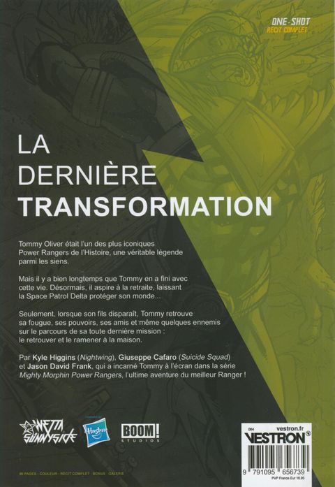 Tommy Oliver était l'un des plus iconiques Power Rangers de l'Histoire, une véritable légende parmi les siens. Mais il y a bien longtemps que Tommy en a fini avec cette vie... Désormais, il aspire à la retraite, laissant la Space Patrol Delta protéger son monde. Seulement, lorsque son fils disparaît, Tommy retrouve sa fougue, ses pouvoirs, ses amis et même quelques ennemis sur le parcours de sa toute dernière mission : le retrouver et le ramener à la maison. Par Kyle Higgins (Nightwing), Giuseppe Cafaro (Suicide Squad) et Jason David Frank, celui qui a incarné Tommy dans la série tv originale Mighty Morphin Power Rangers, l'ultime aventure du meilleur Ranger !