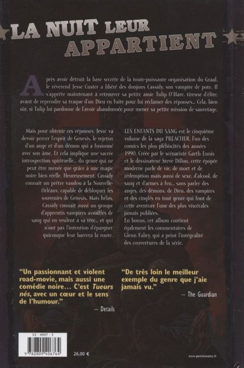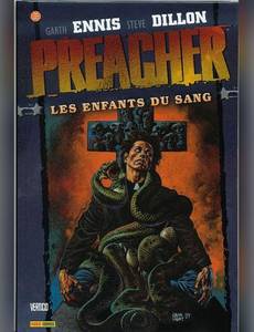 Après avoir détruit la base secrète de la toute-puissante organisation du Graal, le révérend Jesse Curter a libéré des donjons Cassidy, son vampire de pote. Il s'apprête maintenant à retrouver sa petite amie Tulip O'Hale, tireuse d'élite, avant de reprendre sa traque d'un Dieu en fuite pour lui réclamer des réponses. Cela, bien sûr, si Tulip lui pardonne de l'avoir abandonnée pour mener sa petite mission de sauvetage. Mais pour obtenir ces réponses, Jesse va devoir percer l'esprit de Genesis, le rejeton d'un ange et d'un démon qui a fusionné avec son âme. Et cela implique une sacrée introspection spirituelle du genre qui ne peut être menée que grâce à une magie noire bien réelle. Heureusement, Cassidy connaît un prêtre vaudou à la Nouvelle-Orléans, capable de débloquer les souvenirs de Genesis. Mais, hélàs, Cassidy connaît aussi un groupe d'apprentis vampires assoiffés de sang qui en veulent à sa tête et qui n'ont pas l'intention d'épargner quiconque leur barrera la route. Les enfants du sang est le cinquième volume de la saga Preacher, l'un des comics les plus plébiscités des années 1990. Créée par le scénariste Garth Ennis et le dessinateur Steve Dillon, cette épopée moderne parle de vie, de mort et de rédemption mais aussi de sexe, d'alcool, de sang et d'armes à feu sans parler des anges, des démons, de Dieu, des vampires et des cinglés en tout genre qui font de cette aventure l'une des plus viscérales jamais publiées. En bonus, cet album contient également les commentaires de Glenn Fabry, qui a peint l'intégralité des couvertures de la série.