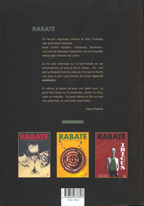 "Ce recueil regroupe comme le titre l'indique mes premières histoires.Dans l'ordre "Exode", "Vacances, vacances", "La Mort de Monsieur Kassowich" et une nouvelle version des "Amants de Lucie".Je me suis interrogé sur le bien-fondé de ces exhumations, et puis je les ai relues... Ah, c'est pas la Chapelle Sixtine, mais ça n'est pas la honte non plus, à part "Les Amants de Lucie" (que j'ai améliorée).Et même, je pense qu'avec une belle couv', ça peut faire beau sur la cheminée, cacher un trou, caler un meuble... Ca peut même se lire, vu que mes planches, là, sont bien imprimées.""Pascal Rabaté".