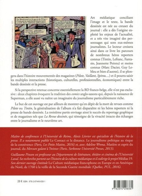 Art médiatique conciliant l'image et le texte, la bande dessinée est née au creuset du journal : elle a dès l'origine exploité les enjeux de l'actualité, et a très vite imaginé des personnages qui sont eux-mêmes journalistes. Le lecteur croisera ainsi dans ce livre les parcours de nombreux héros reporters connus (Tintin, Lefranc, Fantasio, Jeannette Pointu) et moins connus (Marc Dacier, Guy Lebleu et bien d'autres), il se plongera dans l'histoire mouvementée des magazines (Pilote, Vaillant, Spirou...) et il pourra saisir les multiples interactions (historiques, culturelles, professionnelles, économiques) entre la bande dessinée et la presse. Si la perspective retenue concerne essentiellement la BD franco-belge, elle n'est pas exclusive : deux chapitres évoquent la tradition des comics anglo-saxons qui, depuis la naissance de Superman, a elle aussi vu naître un imaginaire du journalisme particulièrement riche. Le but de cet ouvrage est par ailleurs de montrer qu'en dépit de la mort de revues comme Pilote ou Tintin, la généralisation de l'album n'a fait disparaître ni les héros reporters ni la presse de bande dessinée. La troisième partie envisage ainsi le succès du reportage graphique et de magazines tels que La Revue dessinée, qui témoigne de la vivacité intacte des échanges entre le journalisme et le neuvième art. Maître de conférences à l'Université de Reims, Alexis Lévrier est spécialiste de l'histoire de la presse. Il a notamment publié Le Contact et la distance. Le journalisme politique au risque de la connivence (Paris, Les Petits Matins, 2016) et, avec Adeline Wrona, Matière et esprit du journal, du Mercure galant à Twitter (Paris, Sorbonne Université Presses, 2013). Guillaume Pinson est professeur au Département de littérature, théâtre et cinéma de l'Université Laval. Ses recherches portent sur l'histoire de la culture médiatique et il codirige le projet Médias 19. Son dernier ouvrage s'intitule La Culture médiatique francophone en Europe et en Amérique du Nord, de 1760 à la veille de la Seconde Guerre mondiale (Québec, PUL, 2016).