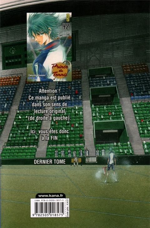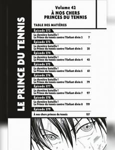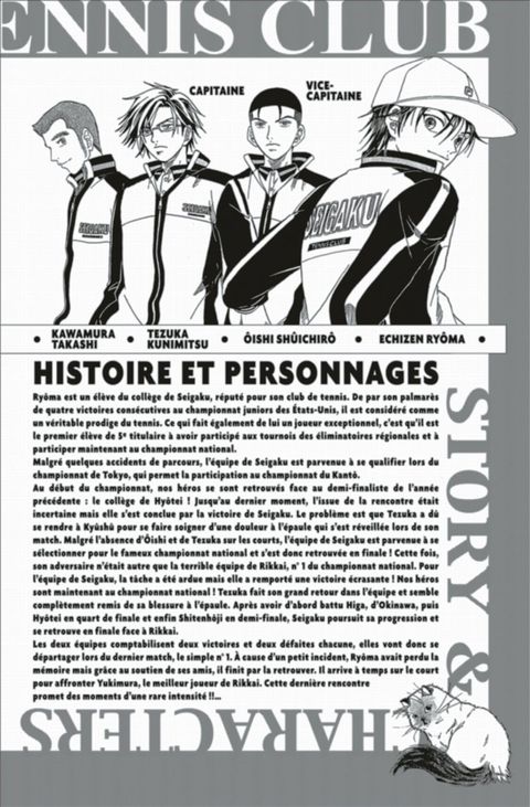 Le championnat national est sur le point de se terminer. Avec deux victoires et deux défaites chacune, les deux équipes qui s'affrontent pour la finale ne comptent plus que sur leur dernier match en simple n°1. D'un côté, Ryôma qui porte le destin de son équipe et de l'autre, Yukimura que tout le monde appelle l'enfant divin. Le combat est sans pitié mais lequel des deux parviendra à dominer...?! Voici le dernier volume d'une oeuvre révolutionnaire qui a su mettre l'esprit sportif sur un piédestal !!