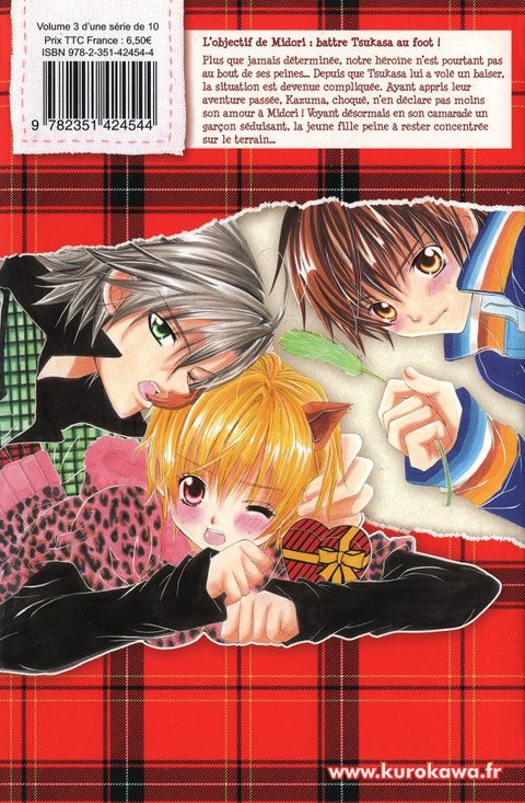 Après le match amical entre les lycées de Midori et Tsukasa, Kazuma vient déclarer son amour à notre héroïne. Mais Midori refuse de répondre positivement aux sentiments de son ami. Kazuma, cependant, ne s'avoue pas vaincu. De son côté, Tsukasa subit une pression de plus en plus forte de la part du proviseur de son lycée. Le jeune homme a aussi d'autres soucis en tête, en premier lieu desquels ses sentiments inavoués pour Mi-dori... L'aventure continue pour Midori, l'apprentie footballeuse déguisé en garçon ! Comment va-t-elle réagir face aux tendres sentiments de ses camarades de jeu ? Un troisième vo-lume qui, une fois encore, fait la part belle à l'amour...