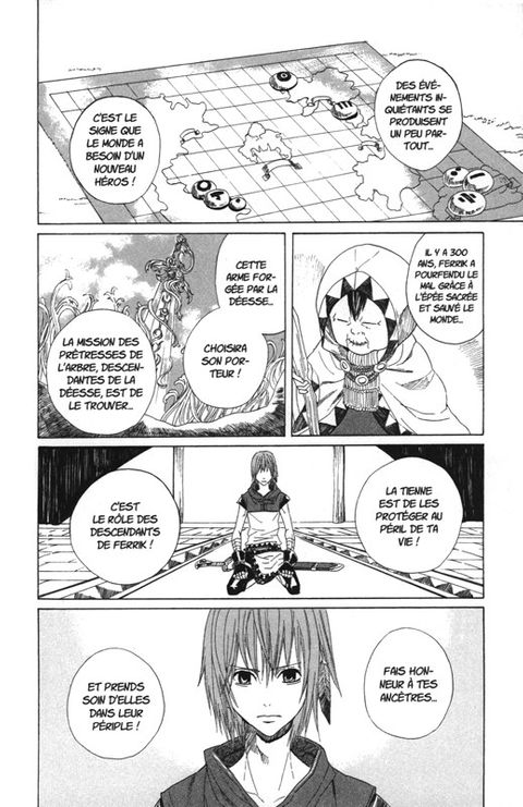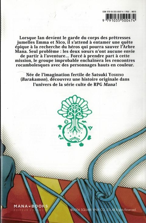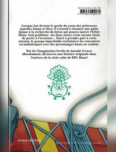 Lorsque Ian devient le garde du corps des prêtresses jumelles Emma et Nico, il s'attend à entamer une quête épique à la recherche du héros qui pourra sauver l'Arbre Mana. Seul problème : les deux soeurs n'ont aucune envie de partir à l'aventure... Forcé à prendre part à cette mission, le groupe improbable enchaînera les rencontres rocambolesques avec des personnages hauts en couleur. Née de l'imagination fertile de Satsuki Yoshino (Barakamon), découvrez une histoire originale dans l'univers de la série culte de RPG Mana !