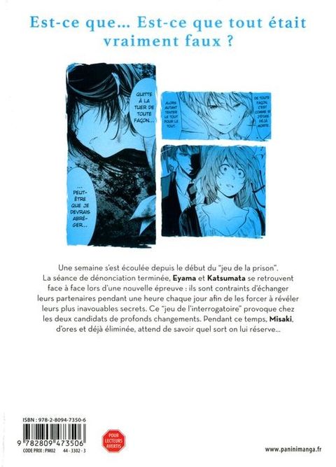 Le "jeu de la prison" vient d'entrer de manière spectaculaire dans sa deuxième semaine. Les candidats restants, Eyama et Katsumata, se retrouvent tous les deux obligés de participer à une compétition au cours de laquelle ils doivent forcer la "partenaire" de leur adversaire à révéler des informations secrètes. Pendant ce temps, l'organisateur du jeu, le mystérieux Kujima, statue sur le sort de Misaki, dont l'avenir reste incertain suite à son élimination...