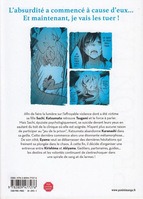 Alors que Katsumata a réussi à mettre la main sur Tsugami et à faire la lumière sur les circonstances de l'agression de sa fille Sachi, il assiste impuissant au suicide de celle-ci, trop abimée par la vie... Ayant perdu sa seule raison de vivre, et avec elle, sa seule motivation pour participer au «jeu de la prison», il décide de relâcher sa captive, Erika Kuranashi.