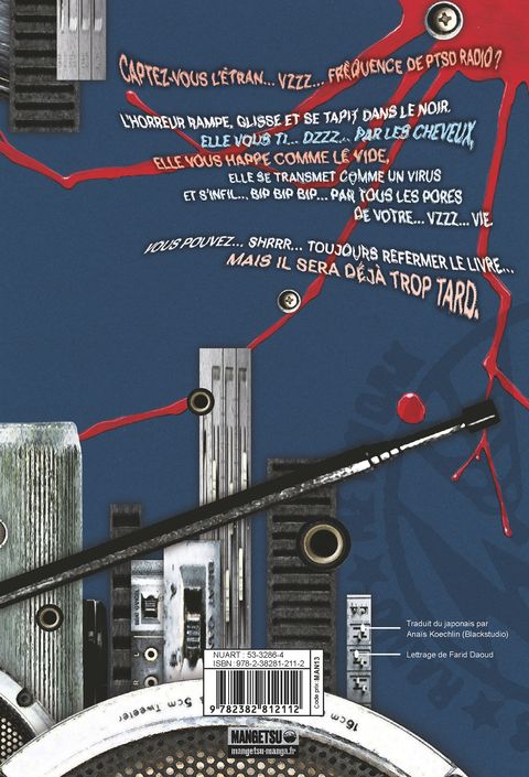 Captez-vous l'étran... vzzz... fréquence de PTSD Radio ? L'horreur rampe, glisse et se tapit dans le noir. Elle vous ti... dzzz... par les cheveux, elle vous happe comme le vide, elle se transmet comme un virus et s'infil... bip bip bip... par tous les pores de votre... vzzz... vie.Vous pouvez... shrrr... essayer de refermer le livre... mais il sera déjà trop tard.Avec PTSD Radio, Masaaki Nakayama, loin d'en être à son coup d'essai dans le domaine de l'horreur, appose ici sa patte avec une intensité saisissante.