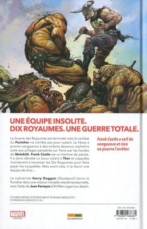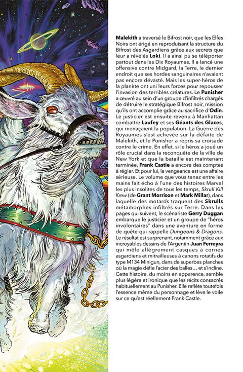 Après les événements de War of the Realms, le Punisher décide de poursuivre sa croisade meurtrière contre les armées de Malekith. Est-ce que vous avez déjà rêvé de voir Frank Castle, au volant d'un van tiré par des chèvres magiques, aller dessouder des trolls ? Voeu exaucé ! Une mini-série complète où l'on retrouve une version plus fun de la croisade du Punisher, en parallèle de la série régulière de Matthew Rosenberg.