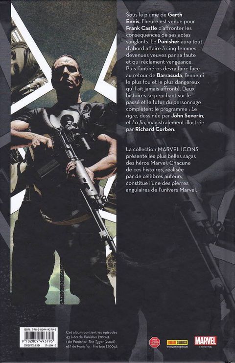 La pègre ne cesse de regretter le jour où elle a tué la famille de Frank Castle. Depuis, le Punisher massacre tous les criminels qu'il croise sur sa route. Mais dans sa croisade, l'anti-héros a lui aussi brisé des familles, et cinq veuves de la Mafia se sont alliées pour se venger de lui. Puis, Frank fait face au retour de Barracuda, l'un de ses pires ennemis, avant de devoir affronter un escadron de Marines envoyé par un général corrompu. Problème : ces soldats sont innocents ! Garth Ennis, scénariste de séries extrêmes telles que The Boys, Preacher ou Crossed, s'attarde rarement sur les super-héros Marvel, sans doute trop "soft" pour lui. En revanche, il s'est trouvé une affinité particulière pour le Punisher, personnage qui lui permet d'explorer tous ses thèmes de prédilection comme la guerre, la vengeance et l'ultraviolence. Cet album recueille les derniers épisodes de son long séjour sur la série, même s'il est régulièrement revenu vers le personnage depuis.
