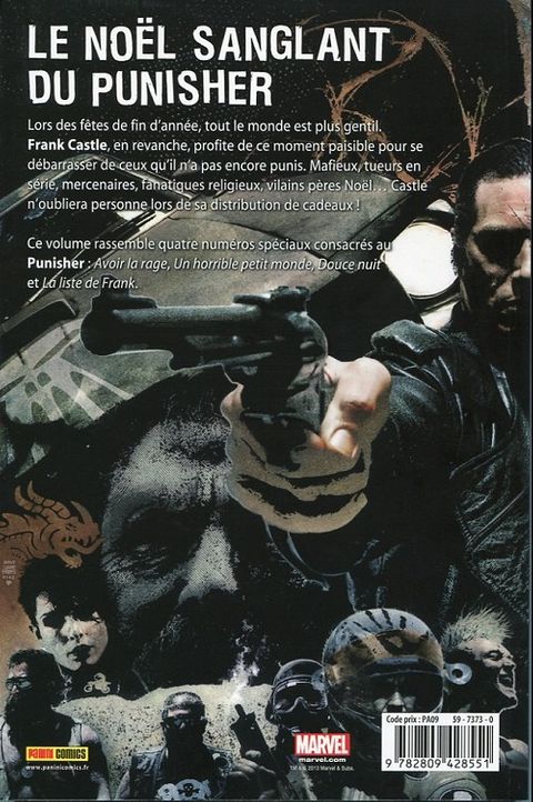 Comme l’an dernier, nous vous proposons un recueil de quatre histoires complètes mettant en scène Frank Castle, alias le Punisher. Dans cet album, il va sauver la vie d’un ancien compagnon d’armes du Vietnam avant d’affronter un déséquilibré, des assassins d’enfants et le Père Noël ! Les meilleurs auteurs de comics passent du côté obscur de l’univers Marvel.