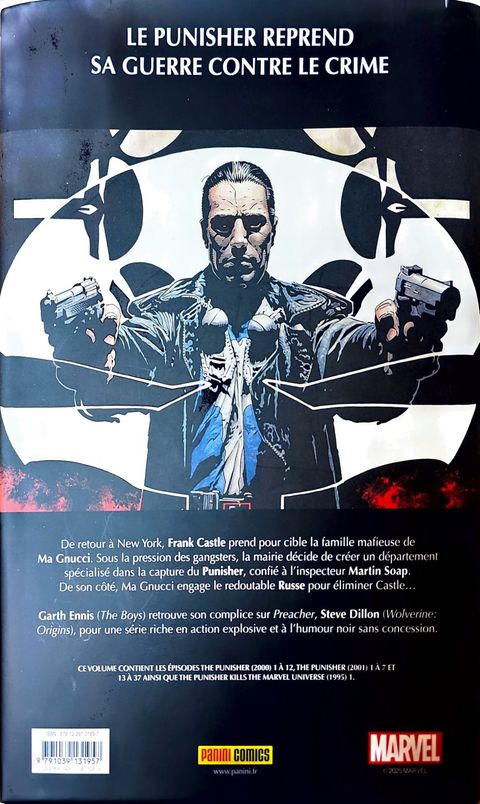 De retour à New York, Frank Castle prend pour cible la famille mafieuse de Ma Gnucci. Sous la pression des gangsters, la mairie décide de créer un département spécialisé dans la capture du Punisher, confié à l'inspecteur Martin Soap. De son côté, Ma Gnucci engage le redoutable Russe pour éliminer Castle... Garth Ennis (The Boys) retrouve son complice sur Preacher, Steve Dillon (Wolverine: Origins) pour une série riche en action explosive et à l'humour noir saignant. On retrouve toutes les qualités qui ont fait le succès d'Ennis qui n'a jamais voulu travailler sur d'autres héros Marvel.