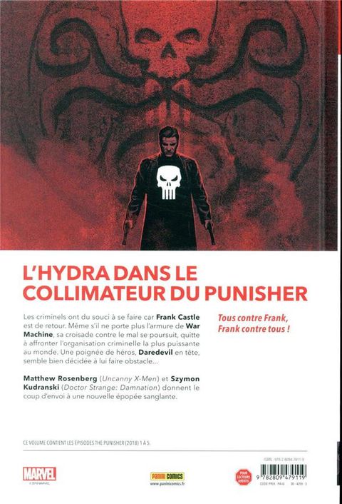 Fort du succès de la saga en deux tomes Punisher Legacy, c'est Matthew Rosenberg (Uncanny X-Men, Hawkeye & Le Soldat de l'Hiver) qui se voit confier les aventures de Frank Castle dans l'ère Fresh Start. Le Punisher a décidé de mettre un terme aux agissements de l'Hydra, mais en attaquant le groupe terroriste il se met à dos le Baron Zémo, ainsi qu'une horde de super-criminels. C'est le début d'une bataille sanglante comme Frank Castle en a rarement connue !