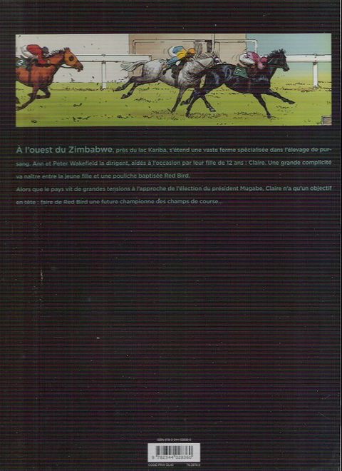 La passion du cheval est une affaire de familleÀ l'ouest du Zimbabwe, près du lac Kariba, s'étend une ferme de plus de 400 hectares spécialisée dans l'élevage de pur-sang. Ann et John Wakefield la dirigent, assistés de Ray, le frère d'Ann. Et pour leur fille Claire, 12 ans, c'est une matinée particulière puisqu'une pouliche est née dans la nuit ! Très vite, une véritable complicité naît entre la jeune fille et le poulain, baptisé Red Bird. Mais alors que le pays vit de grandes tensions à l'approche de l'élection du président Mugabe, Claire, elle, n'a qu'un objectif en tête : faire de Red Bird une future championne des champs de course. Mais son parcours sera semée d'embûches, elle a encore beaucoup à apprendre sur l'élevage équin.Avec l'appui de Camille Vercken, éleveuse de pur-sang, Rodolphe et Michel Faure (sans doute le meilleur dessinateur de chevaux de la bande dessinée contemporaine) lancent une nouvelle série placée sous le signe du sport équestre. Entre saga familiale et parcours initiatique, les auteurs nous font chevaucher dans ce premier tome au coeur des terres sauvages de l'Afrique australe, sur fond de troubles politiques...