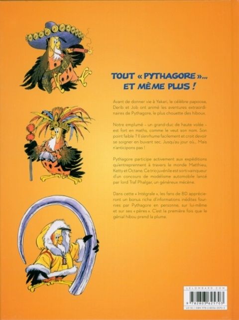 Avant de donner vie à Yakari, le célèbre papoose, Derib et Job ont raconté les aventures extraordinaires de Pythagore, le plus chouette des hiboux. Notre emplumé - un grand-duc de haute volée - est fort en maths, comme le veut son nom. Son point faible ? Il s'enrhume facilement et croit se soigner en buvant sec. Jusqu'au jour où, voyant subitement double, il jurera sur la table des logarithmes que jamais plus il n'avalera une goutte d'alcool. Pythagore participe activement aux expéditions qu'entreprennent à travers le monde Matthieu, Ketty et Octane. Ce trio juvénile est sorti vainqueur d'un concours de modélisme automobile lancé par lord Traf Phalgar, un généreux mécène. Dans cette intégrale, les fans de BD apprécieront un bonus riche d'informations inédites fournies par Pythagore en personne, sur lui-même et sur ses pères. C'est la première fois que le génial hibou prend la plume. Une heureuse surprise !