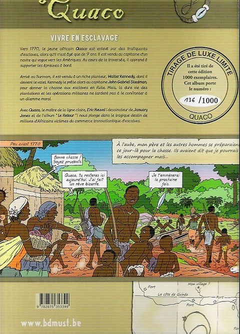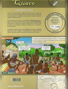 En 1770 le jeune africain Quaco est enlevé et vendu à une plantation en Amérique. Il connaîtra la dure vie des plantations, les opérations militaires contre les esclaves révoltés et... sera affranchi! Avec Quaco, le maître de la ligne claire, Eric Heuvel (dessinateur de January Jones) nous plonge dans le tragique destin de millions d'Africains victime du commerce transatlantique d'esclaves. Une approche très humaine qui permet d'aborder le thème de l'esclavage.