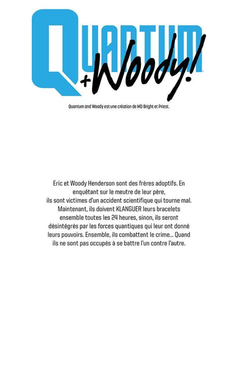 Les vrais héros ont rendez-vous avec leur destin... et parfois, vous et votre frère adoptif êtes piégés dans l'explosion d'un laboratoire qui vous donne des super-pouvoirs. Eric et Woody Henderson (alias Quantum et Woody) doivent cependant «klanguer» leurs bracelets toutes les 24 heures s'ils ne veulent pas que leurs atomes se désintègrent ! Le soucis, c'est qu'ils ne sont pas en bons termes en ce moment, ce qui pose problème lorsqu'il s'agit de jouer aux super-héros. En effet, Eric connait l'identité du père biologique de Woody... et il lui a caché ce secret pendant des années.