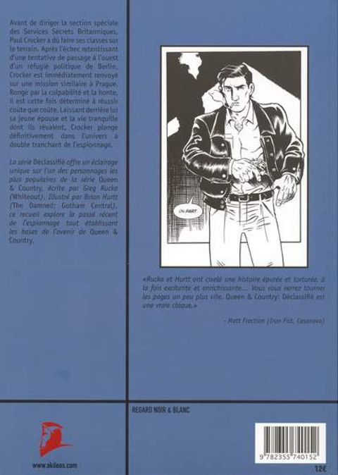 Avant de diriger la section spéciale des Services Secrets Britanniques, Paul Crocker a dû faire ses classes sur le terrain. Après l'échec retentissant d'une tentative de passage à l'ouest d'un réfugié politique de Berlin, Crocker est immédiatement renvoyé sur une mission similaire à Prague. Rongé par la culpabilité et la honte, il est cette fois déterminé à réussir coûte que coûte. Laissant derrière lui sa jeune épouse et la vie tranquille dont ils rêvaient, Crocker plonge définitivement dans l'univers à double tranchant de l'espionnage. La série Déclassifié offre un éclairage unique sur l'un des personnages les plus populaires de la série Queen & Country, écrite par Greg Rucka (Whiteout). Illustré par Brion Hurtt (The Damned ; Gotham Central), ce recueil explore le passé récent de l'espionnage tout établissant les bases de l'avenir de Queen & Country.