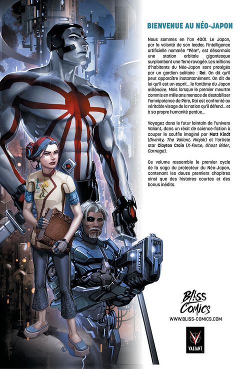 Nous sommes en l'an 4001. Le Japon, par la volonté de son leader, l'intelligence artificielle nommée "Père", est désormais une station orbitale gigantesque surplombant une Terre ravagée. Les millions d'habitants du Néo-Japon sont protégés par un gardien solitaire : Rai. On dit qu'il peut apparaître instantanément. On dit de lui qu'il est un esprit... le fantôme du Japon millénaire. Mais lorsque le premier meurtre commis en mille ans menace de destabiliser l'omnipotence de Père, Rai est confronté au véritable visage de la nation qu'il défend... et à sa propre humanité perdue... Voyagez dans le futur lointain de l'univers Valiant, dans un récit de science-fiction à couper le souffle imaginé par Matt Kindt (Divinity, The Valiant, Ninjak) et l'artiste star Clayton Crain (X-Force, Ghost Rider, Carnage). Ce volume rassemble le premier cycle de la saga du protecteur du Néo-Japon, contenant les douze premiers chapitres ainsi que des histoires courtes et des bonus inédits.