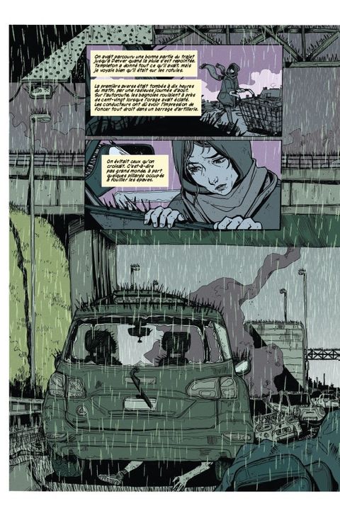 À Boulder dans le Colorado, le ciel est dégagé et Honeysuckle Speck ne pourrait pas être plus heureuse. En cette journée d'aout ensoleillée, elle emménage enfin avec sa petite amie Yolanda. Mais quand le rêve tourne au cauchemar et que des nuages sombres s'accumulent libérant une pluie de clous qui déchiquettent la peau de ceux qui ne sont pas protégés, leur monde vole littéralement en éclat.<em>RAIN </em>donne de la vie à la progression de cet événement apocalyptique, alors que le déluge de clous se répand à travers le pays et le monde, menaçant tout ce que les jeunes amoureuses Honeysuckle et Yolanda chérissent.<em>L'adaptation captivante de la novella de Joe Hill, acclamée par la critique et best-seller du </em>New York Times<em>, par le scénariste David M. Booher (</em>Canto<em>), la dessinatrice Zoe Thorogood (</em>The Impending Blindness of Billie Scott<em>), et le coloriste Chris O'Halloran (</em>Ha-Ha<em>).</em>