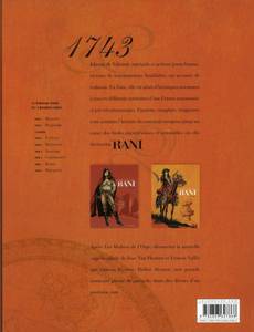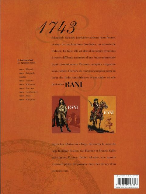 1743 : Johanne de Valcourt, intrépide et ardente jeune femme, victime de machinations familiales, est accusée de trahison. En fuite, elle vit alors d'héroïques aventures à travers différents territoires d'une France tourmentée et pré-révolutionnaire. Passions, complots, vengeance vont conduire l'héroïne du continent européen jusqu'au coeur des Indes mystérieuses et sensuelles où elle deviendra Rani. Après Les Maîtres de l'Orge, découvrez la nouvelle saga familiale de Jean Van Hamme et Francis Vallès, qui signent là, avec Didier Alcante, une grande aventure pleine de panache dans des décors d'un exotisme rare.