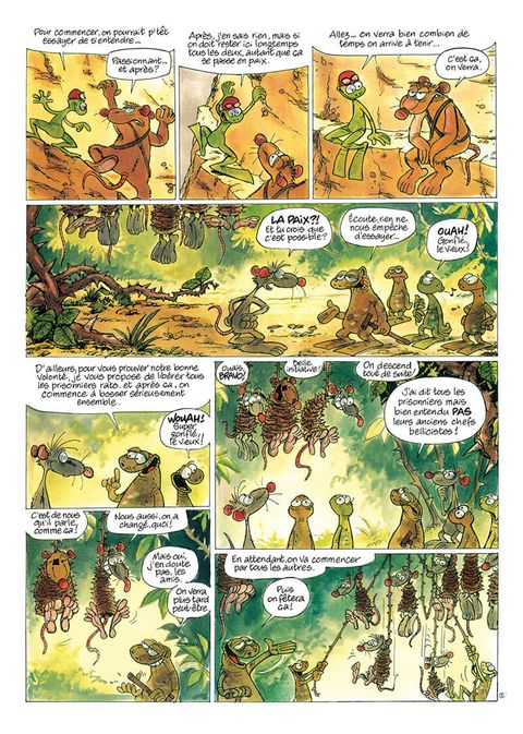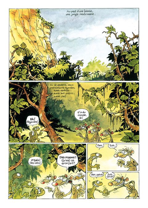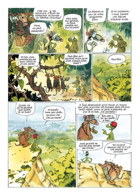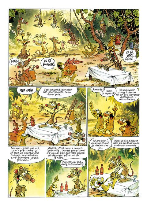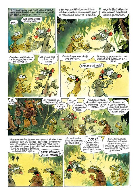 - Qu'est-ce qui empêcherait deux populations hostiles de pactiser comme ça pour voir? - Ben... pas grand chose... - Au début, on était méchamment en concurrence pour la reconquête de notre île... - Mais bon, les hasards de la migration nous ont menés jusqu'ici... - Alors on sait plus quoi faire... - Surtout que nos chefs ont disparu.... - Et si on nous dit pas c'qu'on doit faire, on sait pas! - Sinon on s'rait chefs!