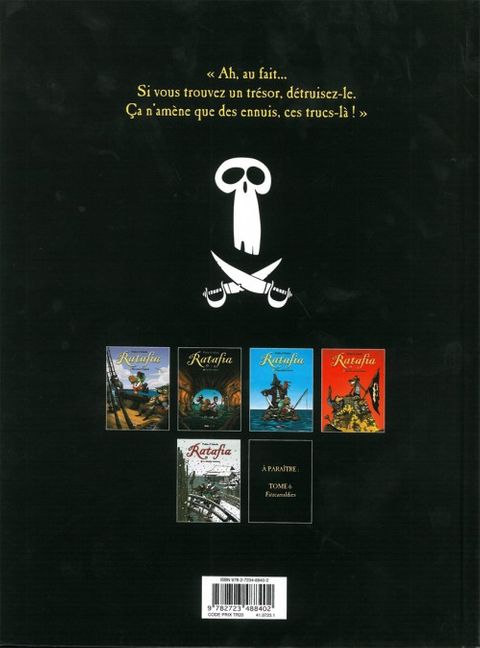 L'équipage déjanté de la Kouklamou est de retour ! Ça y est, le valeureux équipage de la Kouklamou a réussi à se débarrasser de son empêcheur de pirater en rond de capitaine. Mais voilà, problème : le capitaine Charles s'est emparé des cartes au trésor. Nos vaillants pirates se lancent donc à sa poursuite (chacun son tour !), et tout le monde se retrouve sur l'île de Whalala, à la recherche d'un trésor qui n'existe pas. Quant au capitaine, bien qu'abandonné sur un îlot désert au milieu de ses livres chéris, il n'a pas dit son dernier mot. Ratafia est une épopée piratesque hilarante, au ton inspiré de Goscinny et de Gotlib. Retrouvez chez Glénat les cinq tomes de la série dans leur collection historique, Treize Étrange.