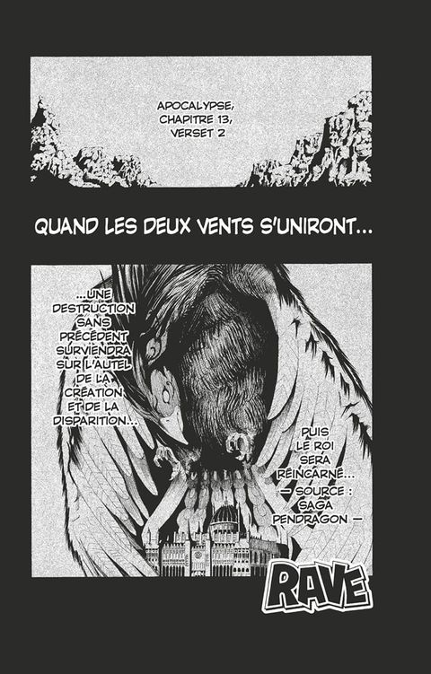 Dark Bring, une pierre sacrée magique et maléfique, se réveille après un sommeil de 50 ans, et tombe entre les mains d'une organisation qui cherche à dominer le monde : Demon Card. Jadis, une seule personne était en mesure de contrôler le pouvoir de Rave, l'autre pierre magique seule à même de contrer les pouvoirs de Dark Bring. Mais le Rave Master a disparu et son successeur n'a pas été trouvé. A moins qu'il ne s'agisse de Haru, un jeune garçon fougueux et téméraire ! Doté d'une épée gigantesque, Haru va peu à peu découvrir qu'il a été choisi pour devenir le nouveau maître de Rave. Parcourant le monde à la recherche des quatre autres fragments de la pierre, il devra également affronter les membres de Demon Card, de dangereux adversaires qu e Dark Bring a doté de pouvoirs terrifiants. ""Rave"" est un grand récit d'aventure, peuplé de personnages fantastiques, rythmé par de l'humour et beaucoup d'action ! Grand succès au Japon, déjà un hit en France !