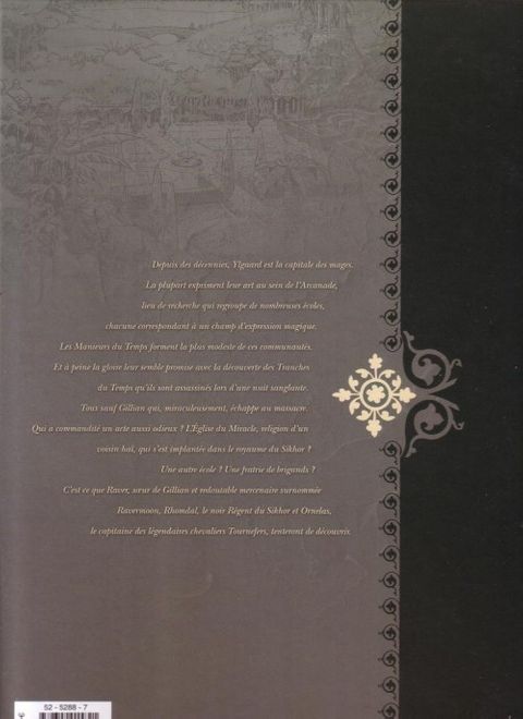 Depuis plus d'un siècle, Ylgaard est la capitale des mages. Ils expriment leur art au sein de l'Arcanade, lieu de recherche qui regroupe de nombreuses écoles, chacune correspondant à un champ d'expression magique. Les Manieurs du Temps forment la plus modeste de ces communautés. À peine accèdent-ils à la gloire avec la découverte des Tranches du Temps qu'ils sont tous assassinés lors d'une nuit sanglante ! Tous sauf Gillian qui, miraculeusement, échappe au massacre. Qui a commandité ces crimes odieux ? L'Église du Miracle, religion d'un voisin haï qui s'est implantée dans le royaume du Sikhor ? Une autre école ? Des brigands ? C'est ce que Nadira, soeur de Gillian et redoutable mercenaire, Rhomdal, le noir Régent du Sikhor, et Ornelas, le capitaine des légendaires chevaliers Tournefers, tenteront de découvrir...