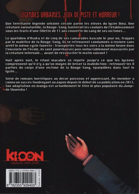 Une terrifiante légende urbaine circule parmi les élèves du lycée Ouma. Une créature surnaturelle, le Rouge-sang, hanterait les couloirs de l'établissement sous les traits d'une fillette de 11 ans couverte du sang de ses victimes. Le quotidien d'Asuka et de cinq de ses camarades bascule dans le cauchemar le jour, où frappés par la malédiction du Rouge-sang, il se retrouvent condamnés à revivre sans arrêt le même cycle funeste : transportés tous les soirs à la même heure sur le campus de l'école, ils sont pourchassés puis inéluctablement massacrés par la créature infernale. avant de ressusciter le matin suivant ! Nuit après nuit, le rituel macabre se répète, jusqu'à ce que les lycéens comprennent qu'il n'y a qu'un moyen de briser la malédiction : retrouver les 8 parties du corps d'une victime du Rouge-sang, éparpillées dans tout le lycée. Série de romans horrifiques à l'ambiance poisseuse et oppressante, Re/member a connu un succès foudroyant au Japon depuis le début de sa publication en 2013. Son adaptation en manga est actuellement la série la plus populaire du Jump+ de Shueisha !