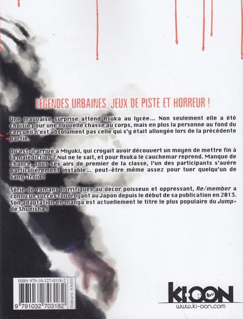 Alors que Miyuki tente de percer le mystère qui entoure les jumelles Onoyama, la Rouge-Sang se met tout à coup à lui répondre, chose qu'elle n'avait jamais faite auparavant ! Si l'indice est mince, il permet néanmoins à la jeune fille de déduire que Miko est sans doute la clé de la malédiction. Les participants décident ensuite d'interroger Haruka, qu'ils soupçonnent d'avoir été impliquée dans la première chasse au corps de Shota, Rumiko et Takahiro. Hélas, leur camarade ne leur apprend pas grand-chose... Mais le septième jour est loin d'être terminé ! Série de romans horrifiques à l'ambiance poisseuse et oppressante, Re/member a connu un succès foudroyant au Japon depuis le début de sa publication en 2013. Son adaptation en manga est actuellement la série la plus populaire du Jump+ de Shueisha !