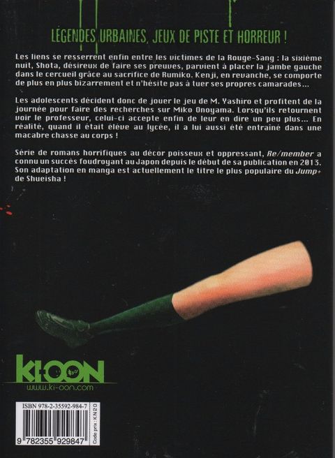 Convaincus qu'il suffit de fuir Haruka pour éviter une nouvelle partie de "chasse au corps", les six adolescents désignés ont tôt fait de déchanter, car la jeune fille les poursuit sans répit, de manière tout sauf naturelle. Impossible de lui échapper ! Heureusement, la deuxième nuit, Takahiro découvre le bras droit de Haruka dans le bureau du proviseur, donnant une lueur d'espoir à ses camarades. Mais Shota a sacrifié Kenji et Rié pour survivre plus longtemps, et les autres ne lui font plus confiance. Ils lui ordonnent alors de se racheter en tuant Haruka pour mettre fin à la malédiction ! Série de romans horrifiques à l'ambiance poisseuse et oppressante, Re/member a connu un succès foudroyant au Japon depuis le début de sa publication en 2013. Son adaptation en manga est actuellement la série la plus populaire du Jump+ de Shueisha !