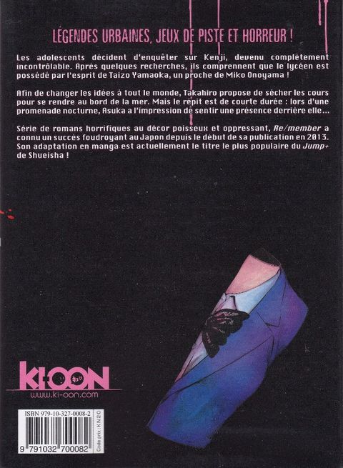 Convaincus qu'il suffit de fuir Haruka pour éviter une nouvelle partie de "chasse au corps", les six adolescents désignés ont tôt fait de déchanter, car la jeune fille les poursuit sans répit, de manière tout sauf naturelle... Impossible de lui échapper ! Heureusement, la deuxième nuit, Takahiro découvre le bras droit de Haruka dans le bureau du proviseur, donnant une lueur d'espoir à ses camarades... Mais Shota a sacrifié Kenji et Rié poursurvivre plus longtemps, et les autres ne lui font plus confiance. Ils lui ordonnent alors de se racheter en tuant Haruka pour mettre fin à la malédiction ! Série de romans horrifiques à l'ambiance poisseuse et oppressante, Re/member a connu un uccès foudroyant au Japon depuis le début de sa publication en 2013. Son adaptation en manga est actuellement la série la plus populaire du Jump+ de Shueisha !