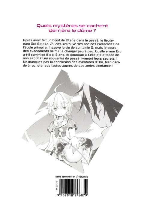 Pénétrer le mystérieux dôme qui emprisonne sa ville natale, telle était la mission du lieutenant Oro. Mais il était loin d'imaginer qu'elle se transformerait en une plongée dans le passé !Après avoir fait un bond de 13 ans dans le passé, le lieutenant Oro Gataka, 24 ans, retrouve ses anciens camarades à l'école primaire. Il sauve la vie de son amie Q, mais le cours des événements se met à changer peu à peu. Quelle erreur Oro a-t-il commise il y a 13 ans, et pourquoi a-t-elle été effacée de son esprit ? Les souvenirs du passé livreront leurs secrets ! Ne manquez pas la conclusion des aventures d'Oro, bien décidé à racheter ses fautes auprès de ses amies d'enfance !