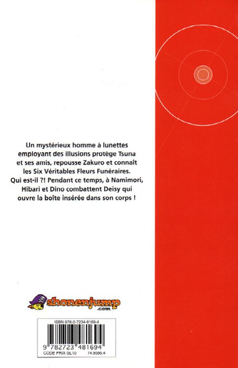 Un mystérieux homme à lunettes employant des illusions protège Tsuna et ses amis, repousse Zakuro et connaît les Six Véritables Fleurs Funéraires. Qui est-il ?! Pendant ce temps, à Namimori, Hibari et Dino combattent Deisy qui ouvre la boîte insérée dans son corps !