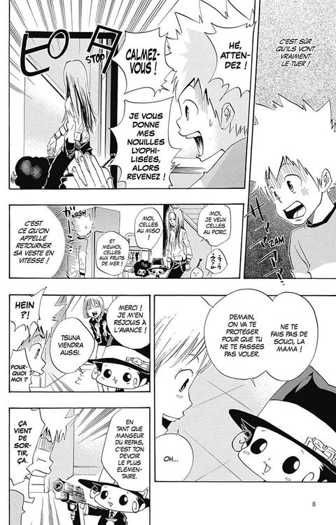 Reborn, qui a l'apparence d'un bébé, est un tueur envoyé par le boss de la famille Vongola, une puissante organisation mafieuse, en quête de successeur, il se rend au Japon pour devenir le tuteur de Tsunayoshi Sawada, un lycéen malchanceux, loser et minable, amoureux transi de la belle Kyoko, une camarade classe. Lorsque Tsuna découvre que Reborn a été engagé par sa mère pour le faire entrer à luniversité, il est scandalisé et choqué de voir qu'il s'agit d'un bébé ! Mais il n'est pas au bout de ses surprises lorsque Reborn sort un revolver, le met en joue, et appuie sur la gâchette ! Abattu d'une balle en plein front, Tsuna s'écroule en regrettant de ne pas s'être déclaré à Kyoko avant de mourir. C'est alors que... Reborn est la dernière série à succès du Shônen Jump. Avec ses personnages farfelus, son humour incessant et son concept de résurrection délirant, le manga d'Amano est déjà promis à un succès phénoménal.