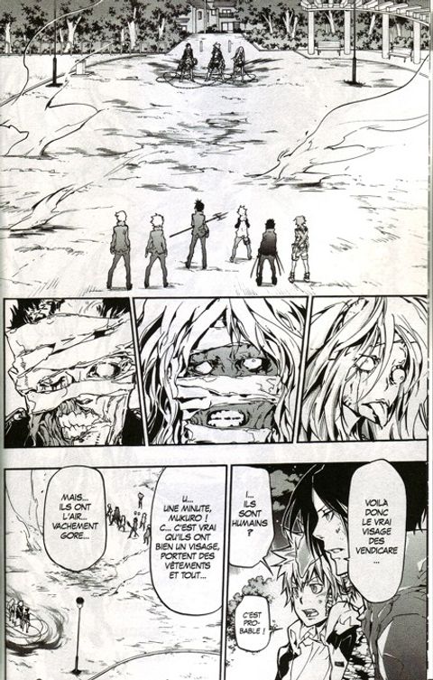 L’attaque combinée des Vongola et des Kokuyô a marché, et a dévoilé la véritable apparence que dissimulaient les manteaux et chapeaux des Vendicare. Tsuna et les siens restent stupéfaits devant celle-ci. Leurs adversaires ont de plus des sortes de tétines en pierre autour du cou. Qui sont en réalité les Vendicare ?!