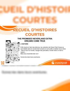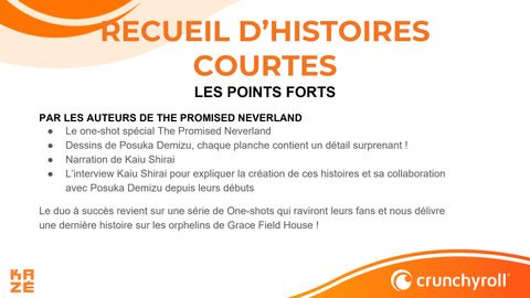 Découvrez dans ce recueil quatre histoires concoctées par les auteurs de The Promised Neverland, ainsi que l'épilogue de leur série phare ! Suspense, action, fantastique, histoires captivantes, personnages charismatiques et graphismes sublimes, tous les ingrédients qui ont fait le succès du duo Kaiu Shirai et Posuka Demizu sont là dans des univers et des ambiances nouvelles et variées, un régal !