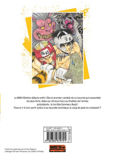 Le MMA Kôshien débute enfin ! Dès le premier combat de ce tournoi qui rassemble les plus forts, Aoba se retrouve face au finaliste de l'année précédente : le terrible Ganmaru Nueji !Pourra-t-il s'en sortir grâce à sa nouvelle technique, le coup de pied en croissant ?Publié dans le magazine Bic Comic des éditions Shogakukan, Red Blue est un manga de sport aux combats dynamiques, scénarisé et dessiné par Atsushi Namikiri.
