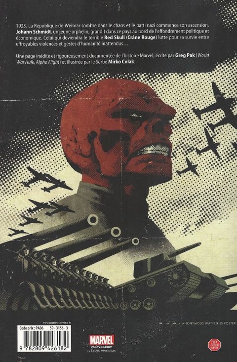 On mesure la valeur d'un héros à ses ennemis. On évalue donc aisément la bravoure de captain america, car son pire adversaire est crâne rouge, un des vilains les plus sanguinaires de l'univers Marvel ! Greg pak (Magneto : Testament) et mirko colak (Secret Warriors) s'attachent dans cette mini-série, à creuser la personnalité du nazi qui faisait même trembler Hitler. Une histoire qui donne un nouvel éclairage sur les premiers pas du terrible vilain.