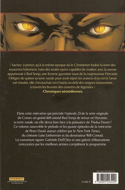 Dans cette mini-série qui précède l'épisode 23 de la série originale de conan, un grand défi attend red sonja de retour en hyrcanie, sa terre natale, où elle devra faire face à la puissance de thulsa doom ce volume rassemble le prélude et les quatre épisodes de la mini-série de peter david. Auteur célébré par le new york times du cinéaste luke lieberman et du dessinateur will conrad. la couverture signée gabriele dell'otto et une galerie d'illustrations concoctées par les meilleurs artistes complètent le programme.