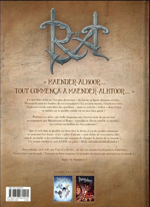 "Maender-Alkoor, tout commença à Maender-Alkoor !" Ce qui était caché ne l'est plus désormais : du fait de sa lignée démone révélée, Wrandrall subit les foudres de ses coéquipiers ! La tension monte, l'incident couve, l'indécent croule sous bien des quolibets, mais ce sont les "reflets" dont il faut se méfier car le gouffre oublié est un lieu bien gardé ! Pendant ces aléas, une belle dragonne aux cheveux noir de jais se voit accompagnée par Moumoune et Roger : consulter le Devin semble se mériter,un cerbère accueillant les fera patienter ! Que ce soit dans le gouffre ou bien chez le devin, il est des points communs ne pouvant être feints : si les "salles d'attente" sont riches de rencontres, elles sont le préalable à des révélations qui risquent de changer le destin de ce monde !... Un drame sibyllin se met enfin en place !