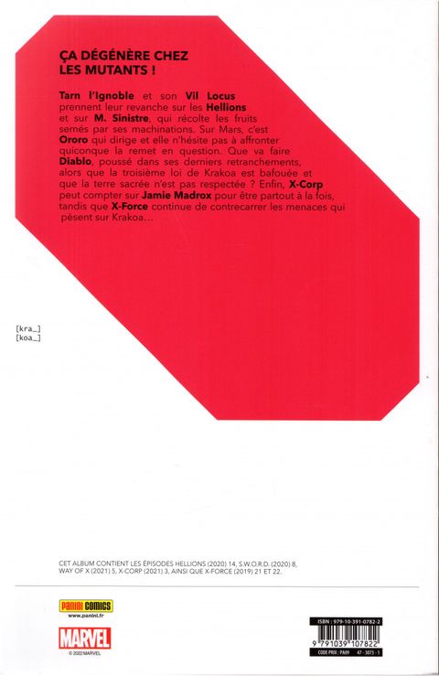 Ca dégénère chez les mutants ! Tarn l'Ignoble et son Vil Locus prennent leur revanche sur les Hellions et sur M. Sinistre, qui récolte les fruits semés par ses machinations. Sur Mars, c'est Ororo qui dirige et elle n'hésite pas à affronter quiconque la remet en question. Que va Diablo, poussé dans ses derniers retranchements, alors que la troisième loi de Krakoa est bafouée et que la terre sacrée n'est pas respectée ? Enfin, X-Corp peut compter sur Jamie Madrox pour être partout à la fois, tandis que X-Force continue de contrecarrer les menaces qui pèsent sur Krakoa... Contient les épisodes US : • Hellions (2020) #14, • S.W.O.R.D. (2020) #8, • Way of X (2021) #5, • X-Corp (2021) #3, • X-Force (2019) #21-22.