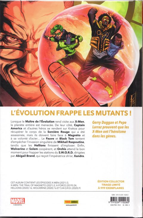 L'évolution frappe les mutants ! Lorsque le Maître de l'Evolution rend visite aux X-Men, la planète entière est menacée. De leur côté, Captain America et d'autres héros se rendent sur Krakoa pour récupérer le corps de la Sorcière Rouge qui a été assassinée, mais ils doivent faire face à Magnéto et sa volonté d'acier... Le Fauve et Black Tom tentent d'empêcher l'invasion singulière de Mikhail Raspoutine, tandis que les Hellions finissent d'imploser. Enfin, Wolverine et Solem coopèrent, et Orchis attend le bon moment pour frapper les stations du S.W.O.R.D. dirigées par Abigail Brand, qui reçoit l'impératrice shi'ar, Xandra. Contient les épisodes US : • X-Men (2021) #3, • X-Men: Trial of Magneto (2021) #2, • X-Force (2019) #24, • Hellions (2020) #16, • Wolverine (2020) #16, • S.W.O.R.D. (2020) #9.