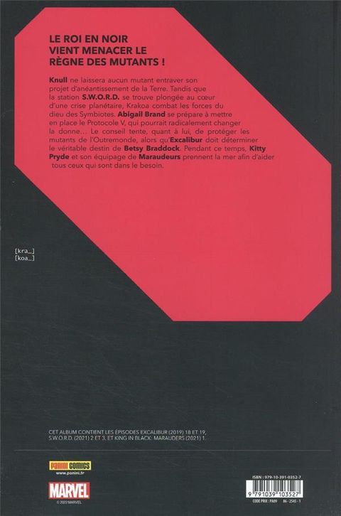 Le roi en noir vient menacer le règne des mutants ! Knull ne laissera aucun mutant entraver son projet d'anéantissement de la Terre. Tandis que la station S.W.O.R.D. se trouve plongée au cœur d'une crise planétaire, Krakoa combat les forces du dieu des Symbiotes. Abigail Brand se prépare à mettre en place le Protocol V, qui pourrait radicalement changer la donne... Le conseil tente, quant à lui, de protéger les mutants de l'Outremonde, alors qu'Excalibur doit déterminer le véritable destin de Betsy Braddock. Pendant ce temps, Kitty Pryde et son équipage de Maraudeurs prennent la mer afin d'aider tous ceux qui sont dans le besoin. Contient les épisodes US : • Excalibur (2019) #18-19, • S.W.O.R.D. (2021) #2-3, • King in Black: Marauders (2021) #1.