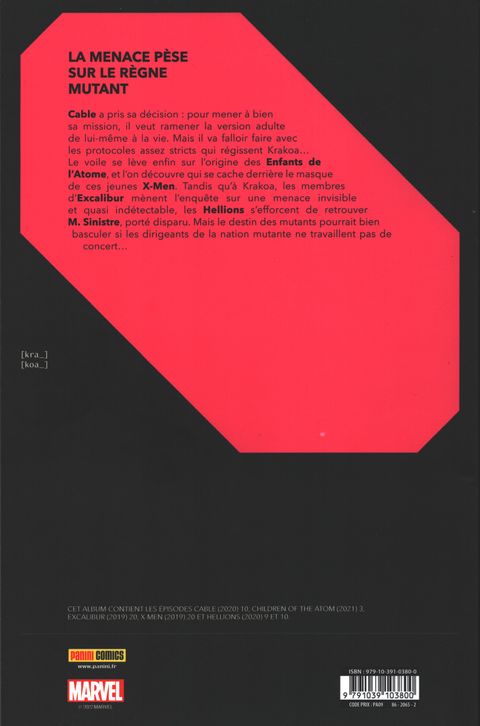 La menace pèse sur le règne mutant Cable a pris sa décision : pour mener à bien sa mission, il veut ramener la version adulte de lui-même à la vie. Mais il va falloir avec les protocoles assez stricts qui régissent Krakoa... Le voile se lève enfin sur l'origine des Enfants de L'Atome, et l'on découvre qui se cache derrière le masque de ces jeunes X-Men. Tandis qu'à Krakoa, les membres d'Excalibur mènent l'enquête sur une menace invisible et quasi indétectable, Les Hellions s'efforcent de retrouver M. Sinistre, porté disparu. Mais le destin des mutants pourrait bien basculer si les dirigeants de la nation mutante ne travaillent pas de concert... Contient les épisodes US : • Cable (2020) #10, • Children of the Atom (2021) #3, • Excalibur (2019) #20, • X-Men (2019) #20, • Hellions (2020) #9-10.