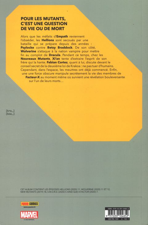 Pour les mutants, c'est une question de vie ou de mort Alors que les méfaits d'Empath reviennent l'obséder, les Hellions sont secoués par une bataille qui se prépare depuis des années : Psylocke contre Betsy Braddock. De son côté, Wolverine s'attaque à la nation vampire pour mettre fin au complot de Dracula. Pendant ce temps, chez les Nouveaux mutants, Xi'an tente d'extraire l'esprit de son frère qui la hante. Fabian Cortez, quant à lui, discute devant le conseil secret de la deuxième loi de Krakoa : ne pas tuer d'humains. Cependant, dans l'espace, les meurtres ont déjà commencé. Enfin, une force obscure manipule secrètement la vie des membres de Facteur-X au moment même où survient une révélation bouleversante sur l'un de leurs morts... Contient les épisodes US : • Hellions (2020) #11, • Wolverine (2020) #11-12, • New Mutants (2019) #18, • S.W.O.R.D. (2020) #5, • X-Factor (2020) #7.