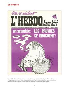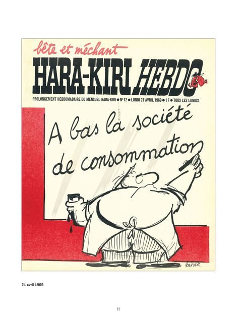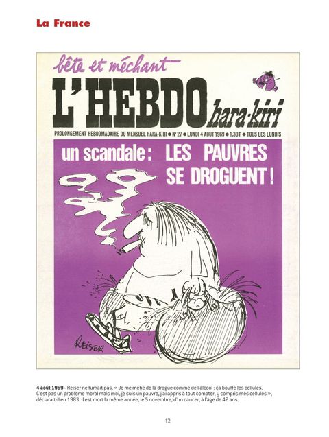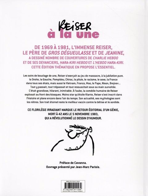 De 1969 à 1981, l'immense Reiser, le père de Gros Dégueulasseet de Jeanine, a dessiné nombre de couvertures de Charlie Hebdo, d' Hara-Kiri Hebdoet de l' Hebdo Hara-Kiri. Cette édition thématique en propose l'essentiel (150 à 200 couvertures). Comme le disait l'un des patrons historiques de Charlie-Hebdo: "Avec une couverture de Reiser, ça s'envolait.Toujours très simple et grandiose." Les soirs de bouclage de «une», Reiser faisait dans le jeu de massacre et la jubilation pure. Le Vietnam, le Concorde, les chasseurs, Franco, Mao, Nixon, Chirac, le pape, la pilule, le racisme, la pornographie, Lady Di... Tout y passait, tout trépassait et tout ressuscitait sous sa main survoltée. À l'aube, le petit monde de Reis er explosait au front des kiosques. Moins star qu'étoile filante, Reiser s'est inscrit dans l'Histoire et plane encore dans l'air du temps. Son actualité est la nôtre. Il nous manque pour mieux résister à la bêtise et au sordide. Ce florilège irradiant marque le retour éditorial d'un génie, mort à 42 ans en 1983, qui a révolutionné le dessin d'humour.